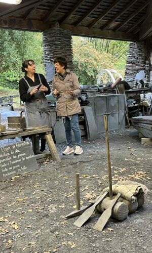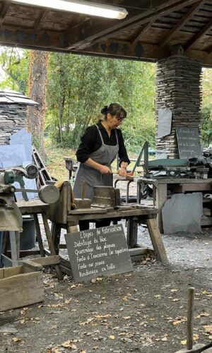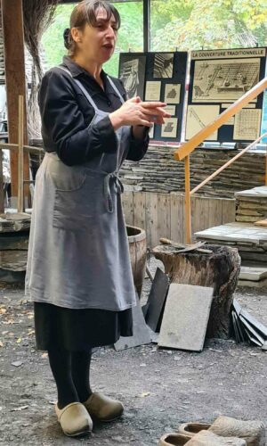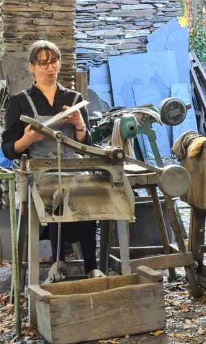 À l’Ardoiserie de Trélazé, nous avons été accueillis par une démonstratrice rigolote, mais absolument maîtresse de son art. Elle nous a dévoilé les secrets d’un métier fascinant, en particulier la technique impressionnante de la séparation feuille par feuille d’un bloc brut extrait des profondeurs de la mine. Un savoir-faire unique qui transforme la roche en fines lames.